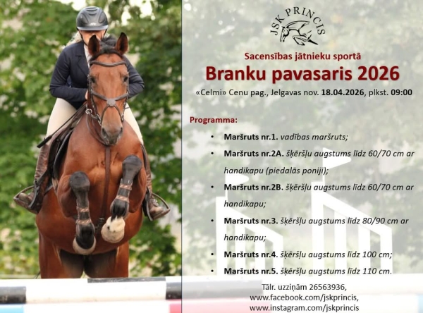 Jau 18.aprīlī JSK "Princis" (Celmi, Cenu pagasts, Jelgavas novads) norisināsies gadskārtējās jātnieku sporta sacensības "Branku pavasaris". Lasīt vairāk ... |